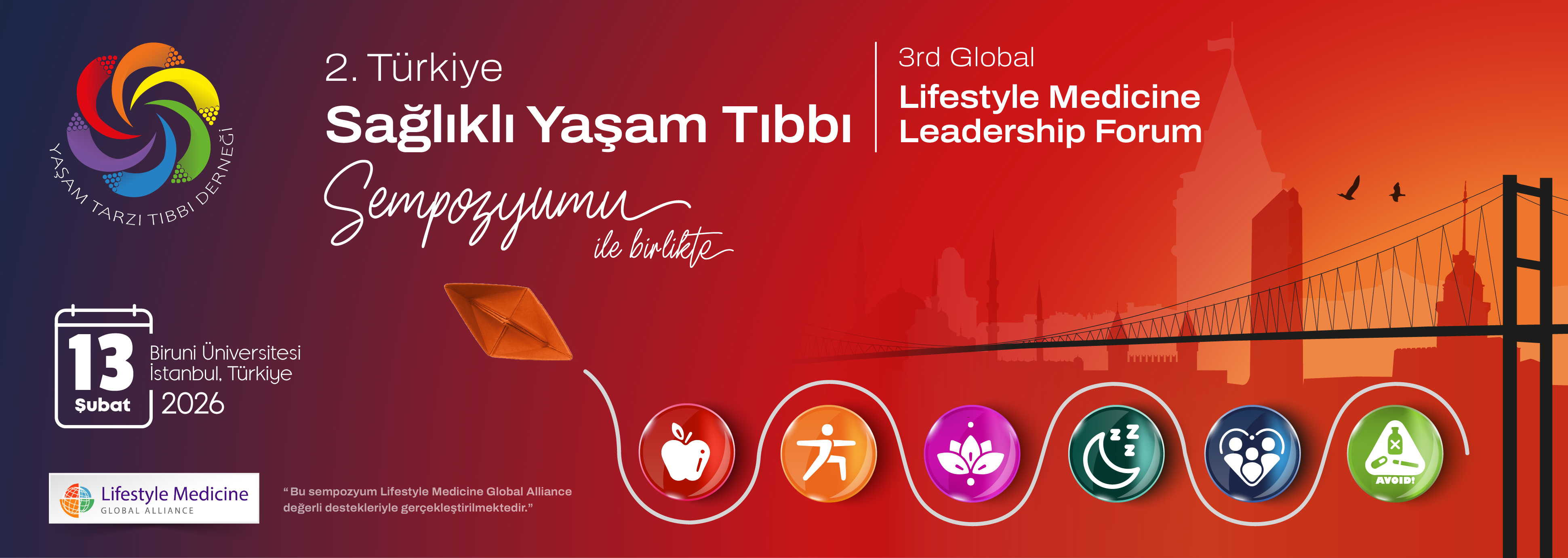 Yaşam Tarzı Tıbbı Derneği olarak uluslararası ortaklarımızla beraber düzenlenen ‘3rd Global Lifestyle Medicine Leadership Forum’a kadim şehir İstanbul’da ev sahipliği yapmanın gururunu yaşıyoruz. Bu kapsamda 13 Şubat 2026 tarihinde Biruni Üniversitesi'nde düzenlenecek olan ‘2. Uluslararası Sağlıklı Yaşam Tıbbı Sempozyumu’na davetlisiniz!